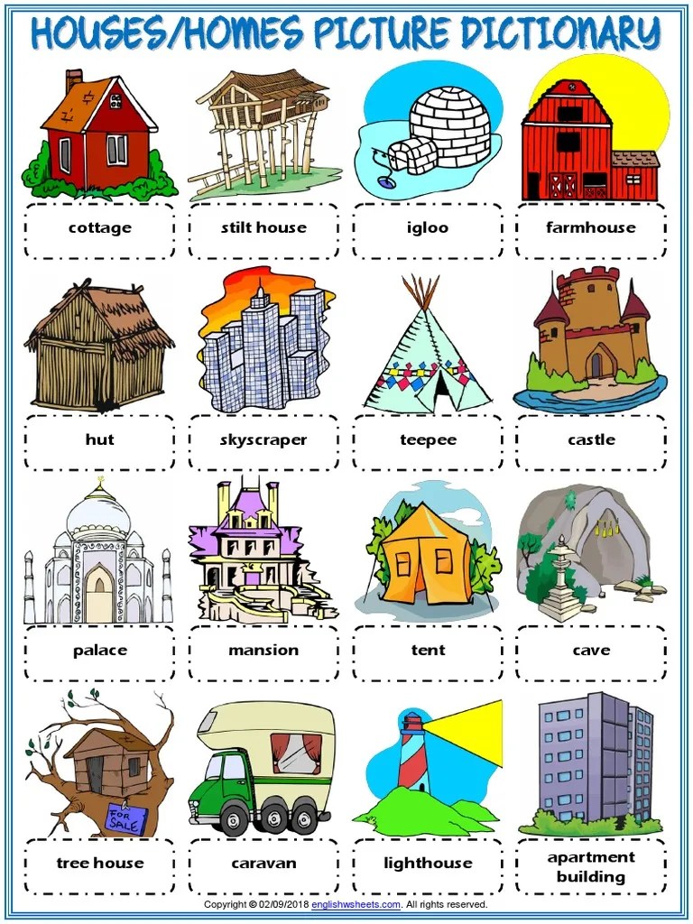 Types of Houses Homes Vocabulary Esl Picture Dictionary Worksheet for Kids