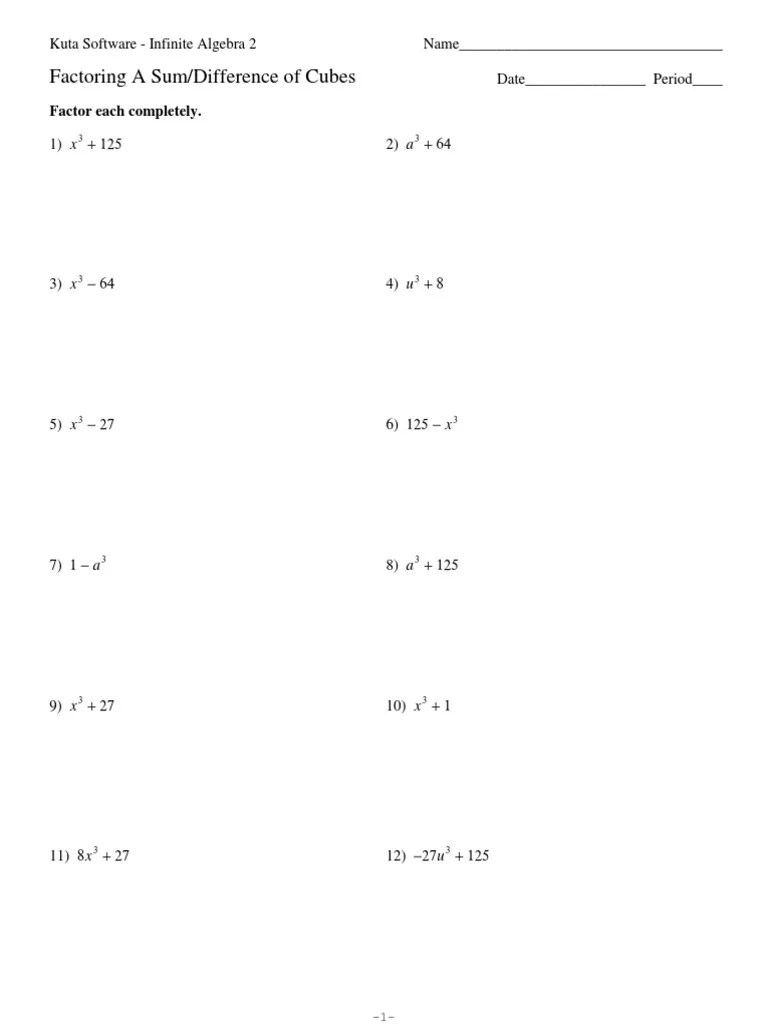 Web factoring sum and difference of cubes worksheet. 1) x3 + 125 2). Web factoring a sum/difference of cubes date_____ period____ factor each completely. Sum of two cubes observations: Web sum or difference of cubes a polynomial in the form a 3 + b 3 is called a sum of cubes.