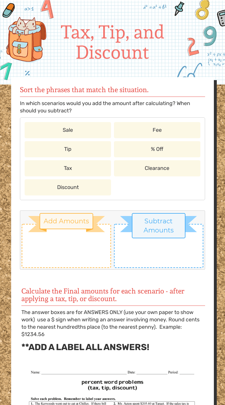 Tax, Tip, and Discount Interactive Worksheet by Kayce Davis Wizer.me